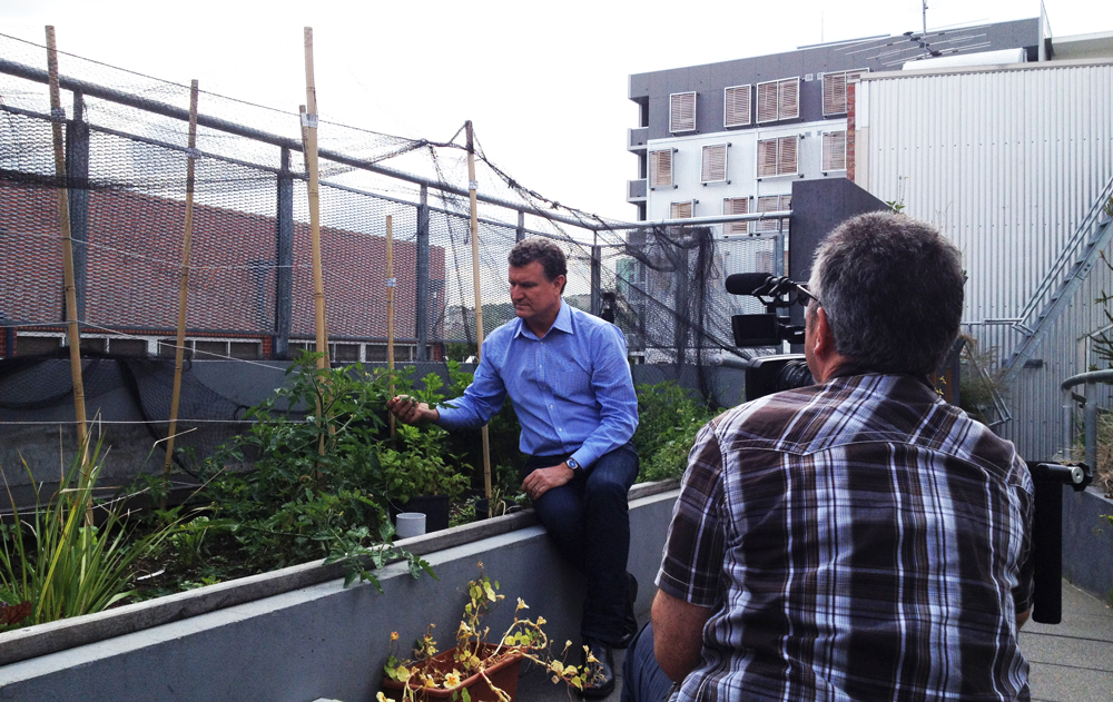 Image of Jary Nemo filming Don Henry inspecting the rooftop garden.